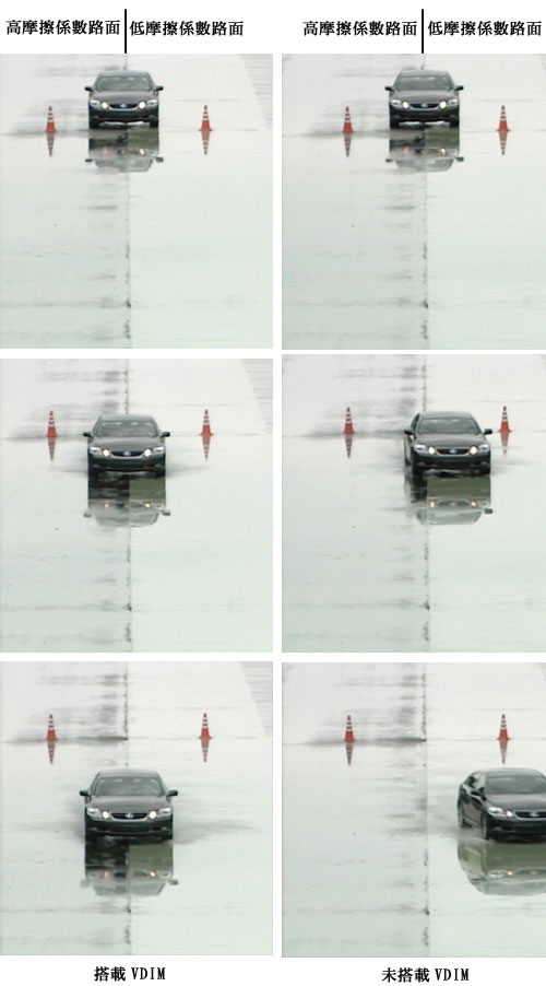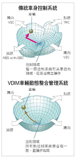 一般配備ABS、TRC、VSC功能的車款,雖具備各種看似完善的防護措施,但所有功能皆依據所屬感知器而進行"獨立"運作,系統版本差異也僅只於介入時機早晚的控制能力,面對多變且突發的失控狀況,欠缺協調性的輔助反而事倍功半,甚至為駕駛人帶來極度地不安,無法進行如VDIM般同時進行整合控制的高度協調能力,可讓車室乘員以安穩舒適,且幾無感覺的面對任何突發狀況,維持高水準的乘坐感受。