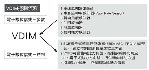 VDIM整合車輛制動輔助系統(ABS防鎖定煞車系統、EBD電子式煞車力分配、BAS緊急煞車力道輔助),車輛動態穩定系統(TRC,VSC),以及可依據車速提供不同輔助力的電子轉向輔助(EPS電子動力轉向系統、VGRS可變齒比方向盤)三大系統,藉由更完整的資訊收集,進行高度協調的車輛動態管理。簡單地說,VDIM可視為行車安全的控制主腦,所有感知器所測得的參數,如輪速、車速、轉向角度等訊號,都以數位信號方式傳送至VDIM這個主腦,再經過精密的高速處理之後,以百萬分之毫秒的時間內,對於各項輔助系統如ABS/EBD/BAS/EPS等,同時進行控制,減少由於各項主動安全系統介入時間的差異帶來的不安感,也提供駕駛者更安穩的行駛體驗。