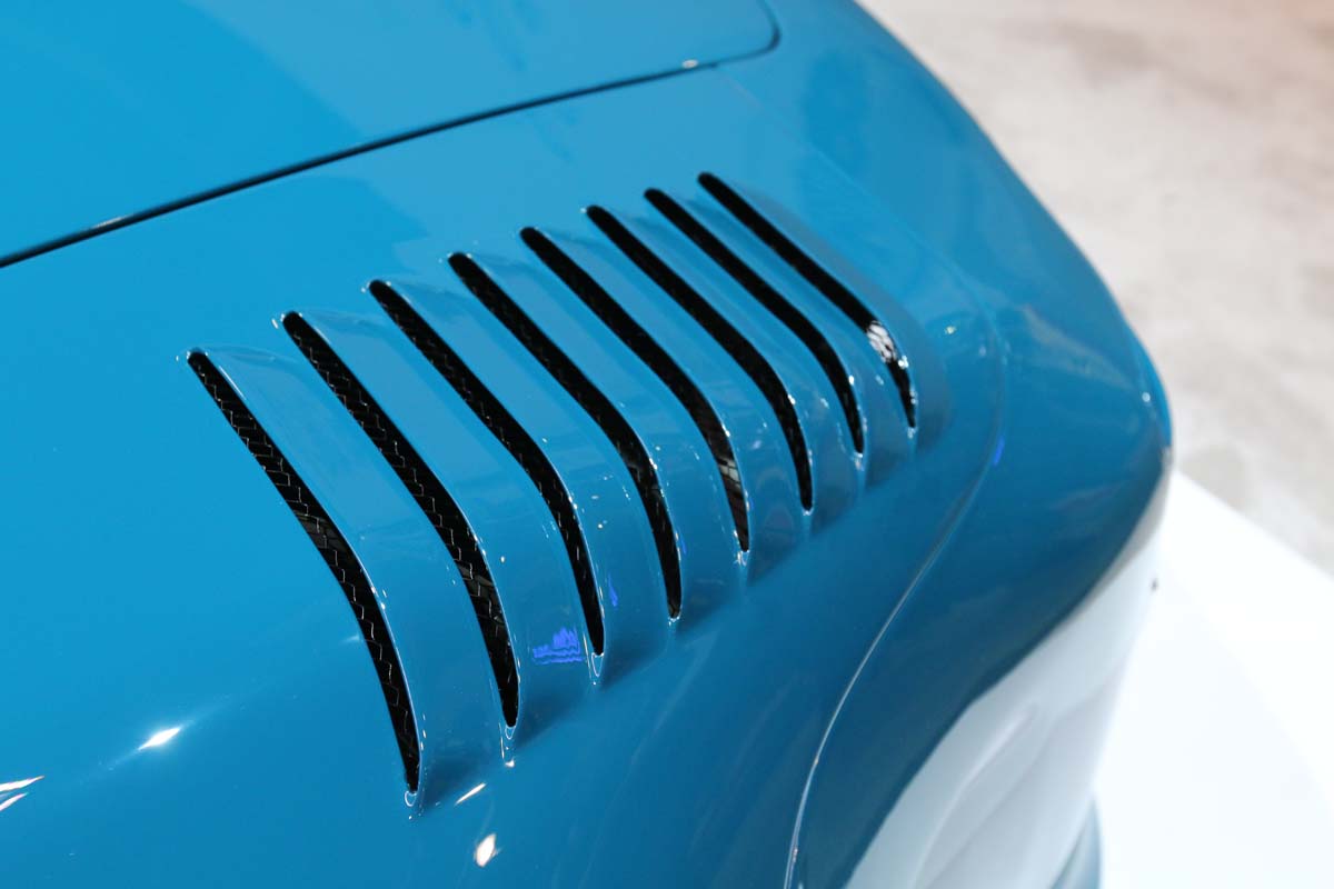 為了達到減輕重量的負擔,可以看到採用碳纖維材質所打造的車頂與海藍色車身有極大差異性,在內裝方面也透過GMG全套防滾籠增加車體安全性,尤其兩張充滿戰鬥氣息的Tecnocraft碳纖維座椅、AIMSPORT GT350方向盤及CAE排檔座,充分提供競技的座艙氛圍。至於底盤方面除了有氣壓懸吊可提供車高調整,透過19吋Rotiform LSR輪圈及前265/30ZR 19和305/30ZR 19 Toyo Proxes R888R輪胎,即為充足的抓地力可隨時應付任何所需。