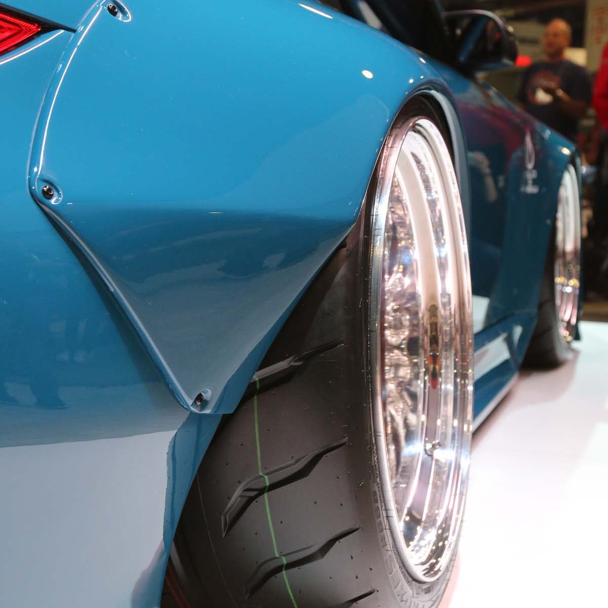 | 透過粗曠的日式寬體爆龜改裝,不僅有助於車側線條更為立體,同時增加的寬度可讓胎圈尺寸加大。 |