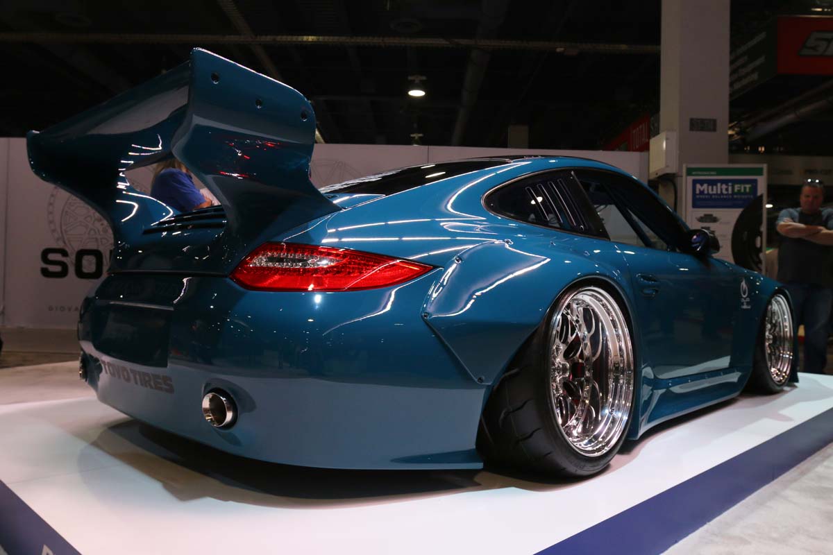 而原本前保桿用來導入冷空氣的氣壩則改由中央氣壩進行支援,雖然撞風的面積相對減小,但是前葉子板上方所增加的散熱導孔則有助於冷卻器排出熱能,相當前衛的車頭造型猛一看似乎與Porsche 935有幾分神似。此外,由於近年來改裝市場相當流行起粗曠的日式寬體,因此寬體葉子板結合側裙讓車身線條更為立體,車尾方面除了有超大型尾翼撐場面之外,刻意向後延伸更有助於引擎散熱及下壓力,而後保桿也整合左右雙出排氣尾管,盡可能達到完整一致性。