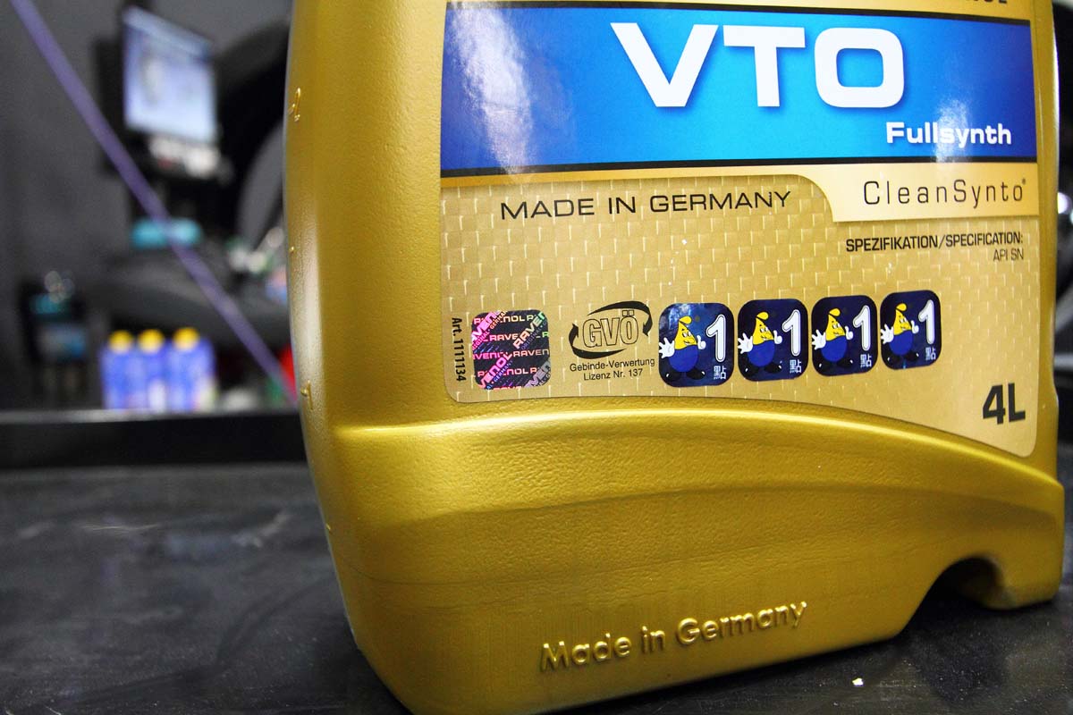 至於這次要介紹的這款Ravenol VTO機油,是結合酯類與PAO基礎油、頂級添加劑與60年來Ravenol賽事經驗,製造而成的頂級賽車機油,除了能應付激烈操駕時的引擎所需的潤滑度,減少機件磨擦,使引擎出力更順暢、有力外,由於製造過程中運用Ravenol獨創的潔淨節能微奈米科技,能使換油里程超過20000公里,符合各大車廠所要求的長效壽命與清潔性等其它標準,目前這款機油也實際運用在Ravenol所贊助的F3、F4、WTCC與各大賽事的賽車中,品質絕對禁得幾考驗。