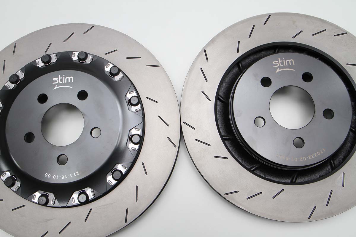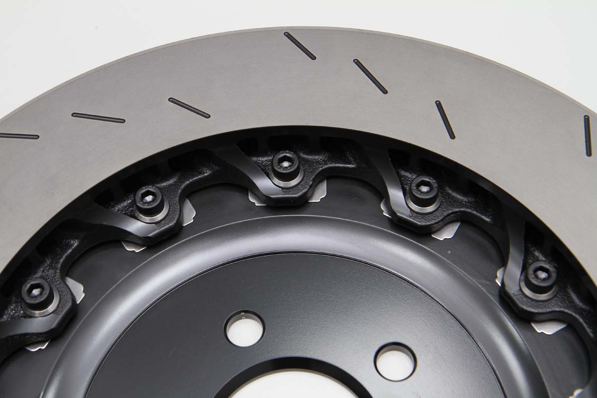 而搭配卡鉗的碟盤部分,直徑330/355mm的碟盤可分成單片式與雙片式設計,而直徑380mm碟盤考量到重量因素,則只有雙片式設計,單/雙片式碟盤本身都是採用FC28頂級高碳鋼材質製成,分別可承受880/920度的高溫,雙片式碟盤的耐溫值比較高的原因在於內部採用特殊的構造處裡,可幫助散熱速度。雙片式中心盤材質為T6061鍛造鋁合金打造,可兼具強度與輕量化效果。