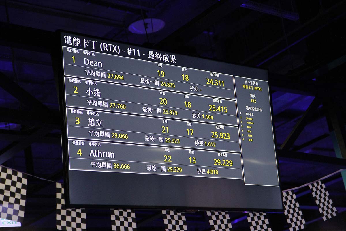 | 賽道大直線上方還設有計時板,可提供虛擬起跑燈號、名次、即時上升及下降名次參考、車手暱稱、車號 、圈數、最佳單圈、平均單圈、最後一圈、單圈秒差等資訊,誰單圈跑得比較快都看得到。 |