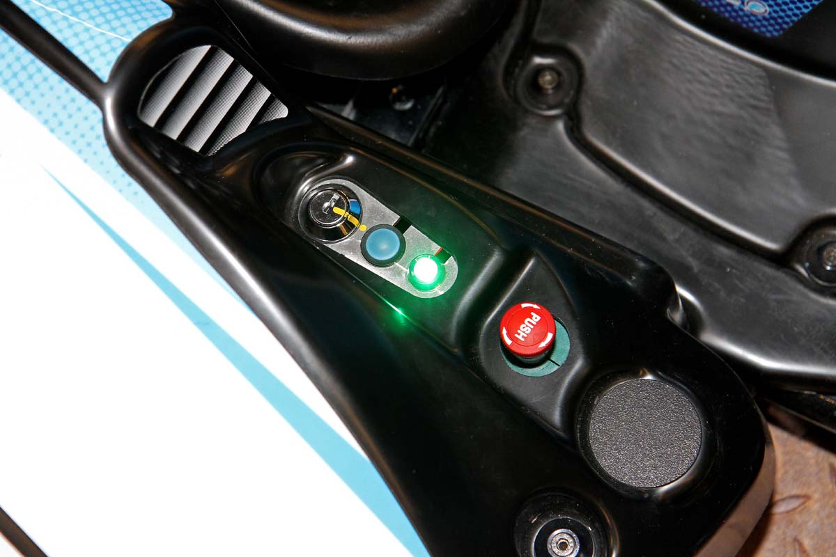| 綠燈後方的藍色按鍵就是倒車鍵,可讓電能卡丁車受困時快速倒車,免除下車推車的困擾。 |
