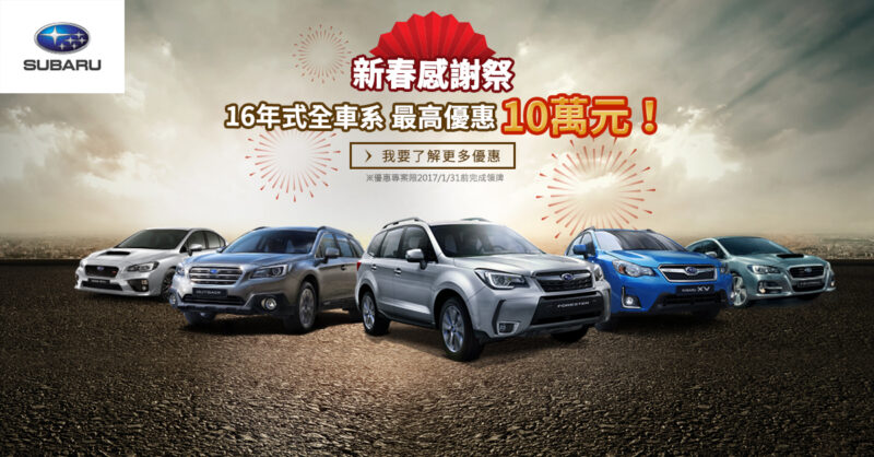 本次活動期間將自即日起至1月31日(限2017年1月31日前完成領牌)全面熱力開跑,想要在農曆新年前入主全新SUBARU汽車的您千萬不容錯過!