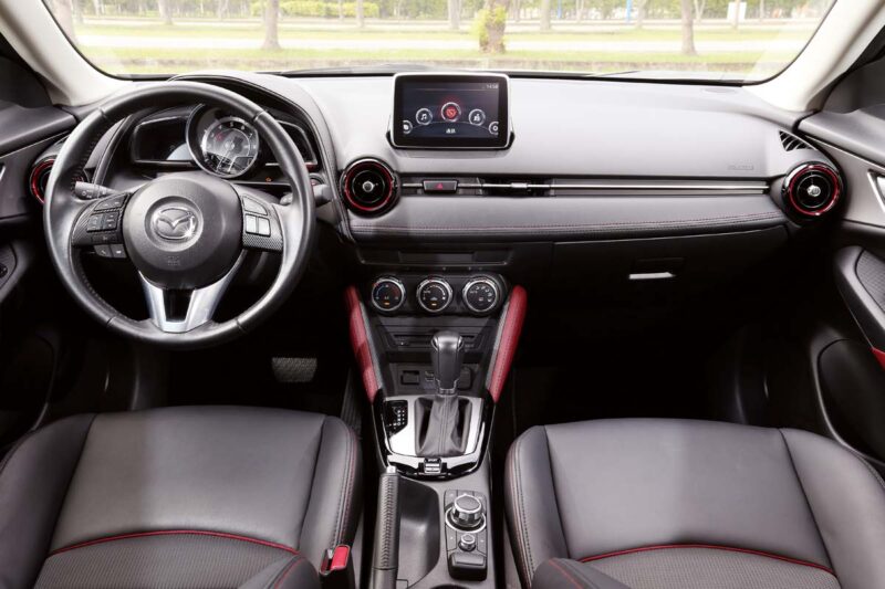 編輯部嚴選百萬內小型CUV(16-9)優質高材生Mazda CX-3頂級CX-3與HR-V走相似調性風格,車內多處皆以皮質包覆藉以提昇整體座艙質感氛圍,不論在視覺感官或實際觸摸,CX-3與HR-V皆為符合多數消費者喜好的規劃。另外透過碳纖維飾板、紅色縫線與皮質、亮面烤漆與