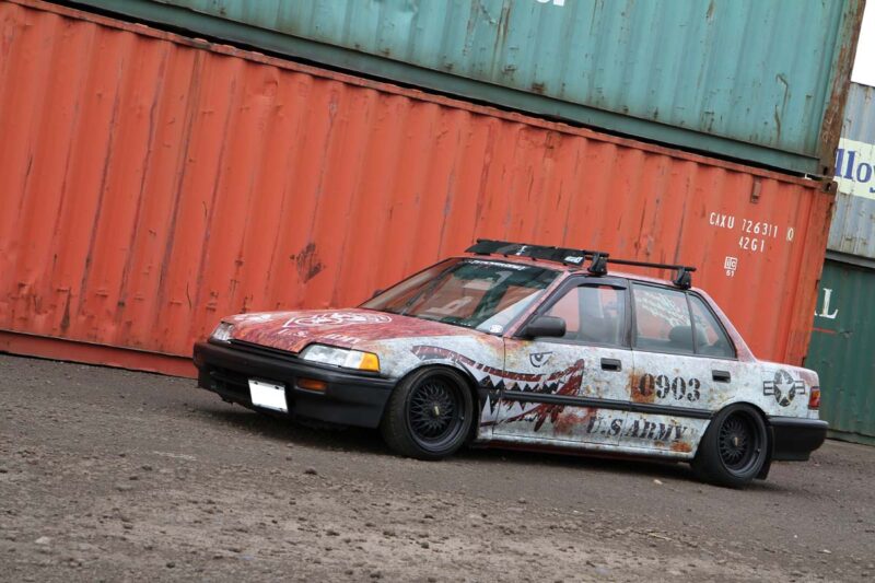 工業風Civic EF鏽蝕狂鯊式樣想要吸引路人目光,讓愛車擁有亮眼醒目的車色是最快速的方法,傳統做法是透過烤漆來達成,不過有些吸睛度破表的顏色例如:電鍍色、髮絲紋或工業鏽蝕等色彩,就無法以烤漆的方式來獲得