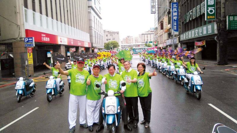 e-moving騎進總統府中華電動二輪車國慶遊行多年來中華e-moving推廣綠能事業不遺餘力,除結合中華電信全國門市開展異業通路進行推廣外,另看準每一鄉鎮推行低碳里願景,於9月率先和桃園市合作共推「一哩低碳 一里幸福」計畫,其策略的成功受到各界矚目,因此今年更受