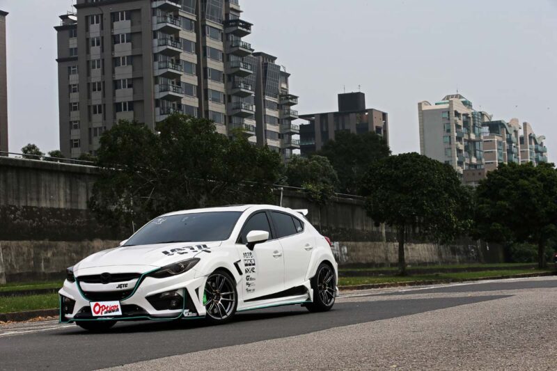 微寬體輕鬆黏上All New Mazda 3 X JGTC想要展現車輛威猛的戰鬥氣勢,最快而有效的方式就是空力外觀進行升級,不過若只有前後保桿更換可能還是不夠特別,但是最一拜的寬體爆龜不是要對愛車動刀切割,要不就是鈑件重新塑形,而不可逆的破壞難