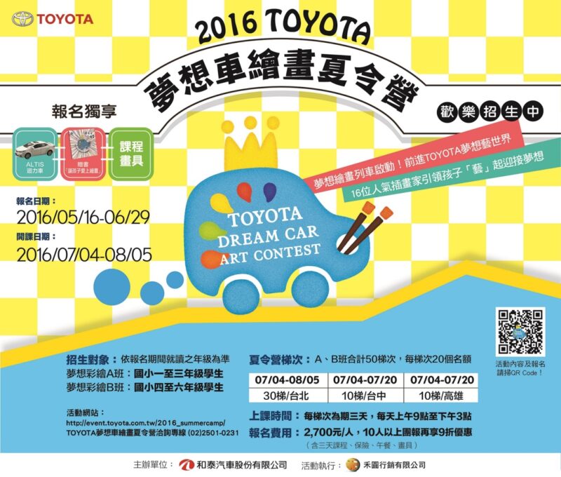 為鼓勵學童發展藝術及創意能力,引導學童發揮想像力,TOYOTA總代理和泰汽車將在2016年7月4日至2016年8月5日於臺北、臺中、高雄三地同步展開「2016 TOYOTA夢想車繪畫夏令營」活動,有別於傳統繪畫班,TOYOTA將號召16位實力與人氣兼具的插畫家擔任導師,以插畫帶領孩子「藝」起迎接夢想!