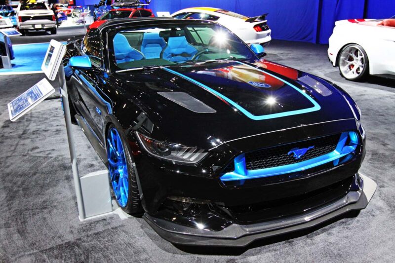 藍配黑最吸睛MAD Ford Mustang GT Convertible這輛Mustang GT Convertible使用亮藍配黑的塗裝,目光很容易被吸引,讓人想要靠近看個仔細。改裝50周年紀念車型的前下擾流板,以及車身側裙、後下分流器等,讓外觀與一般Mustang GT有著截然