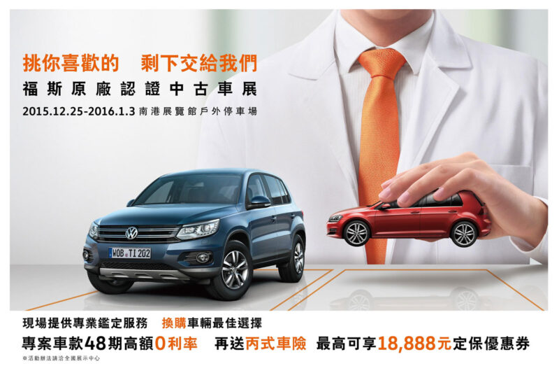 為使消費者便利地選購Volkswagen品牌中古車,台灣福斯汽車於2015年12月25日至2016年1月3日在台北世界貿易中心南港展覽館戶外停車場,舉辦Das WeltAuto. 福斯原廠認證中古車展…