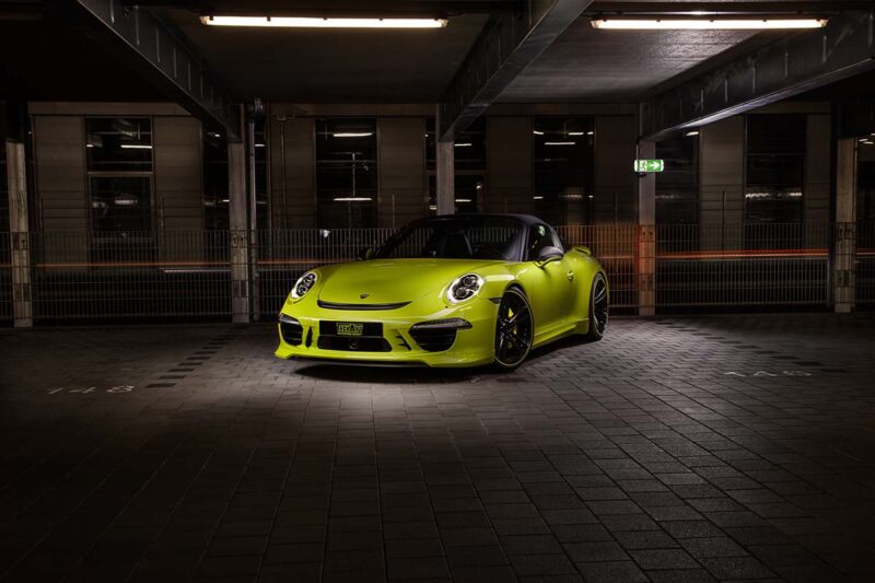 螢光勁裝 Porsche 911 Targa (991)與時尚結合的復古路線,這輛由Techart操刀的上空尤物Porsche 911 Targa,呈現經典之美的極品,從外觀上車體的空力套件組,都採用輕量化PU-RIM材料製成,包括有前保桿下擾流翼、兩側氣壩的空力翼、頭燈組飾環、車頭行李廂蓋下方的氣柵等,