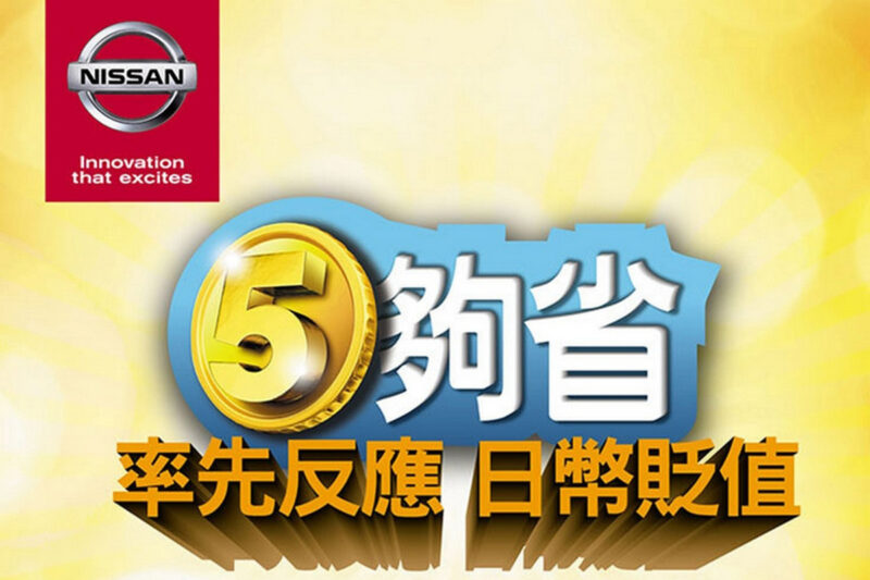 因應日幣貶值,裕隆日產汽車領先同業反映匯差回饋消費者,自即日起至11月底止祭出「5夠省」優惠方案(註1),第1省保險:買車就贈五年竊盜險、第2省利息:高額零利率或全額貸專案二擇一…