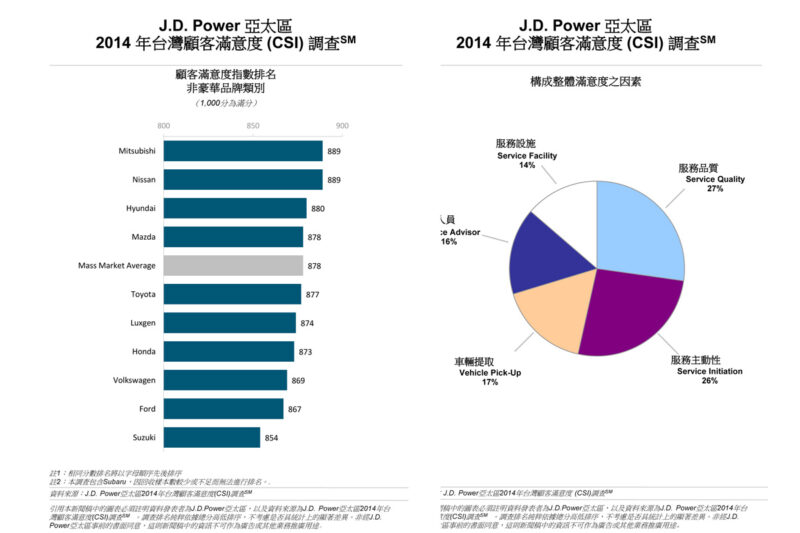 根據今天最新發表的J.D. Power亞太區2014年台灣顧客滿意度 (CSI ) 調查結果顯示,在滿分1000分中,年度銷售排名暫居2、3名的日產及三菱同獲889分躍居滿意度領先位置,而車市銷售龍頭…