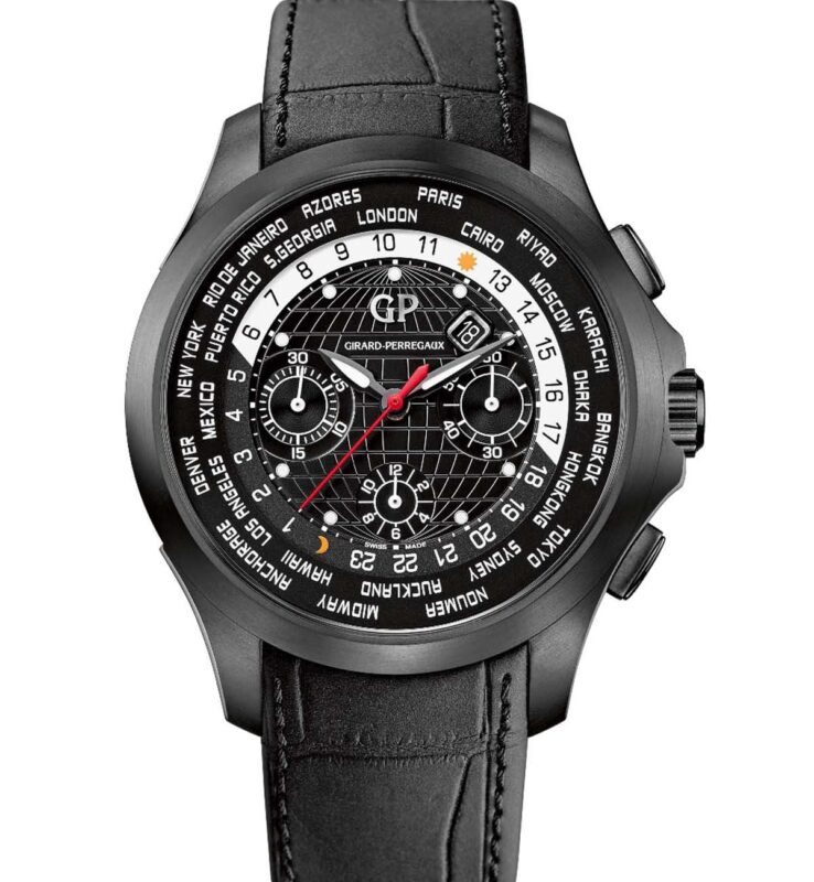 獨具特色的Traveller WW.TC世界時間腕表以剛烈的黑色面貌重臨舞台。全新鈦金DLC型號,表盤中央的紋理象徵地球經度及緯度,而邊緣24個時區代表城市名稱斜面圈環,是創新技術而實用的展現,其自製的自動
