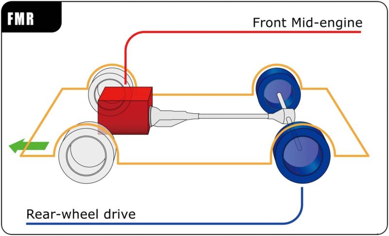所謂中置引擎,是將引擎配置在前輪軸之後,中心落在四輪之間,因此車輛得到良好的前後輪配重比,甚至可達到50:50,擁有敏銳良好的操控性,但因為採後輪驅動,高速過彎時後輪容易側滑,發生轉向過度