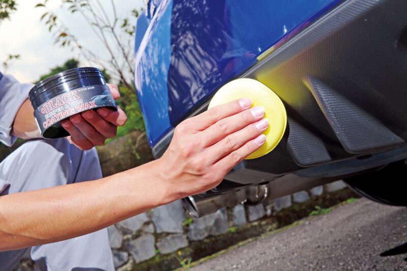 很多休旅車都會在輪拱與側裙採用黑色防刮的塑料材質,甚至有些入門車款的保桿或後視鏡也都是黑色塑料材質。這種材質隨著年歲增加,往往會變質成霧白的顏色。既然洗完車,不如就幫愛車的塑料上一層增黑鍍膜蠟吧。抹上這種黑色蠟品後,塑料件都