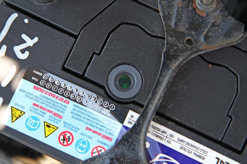 關於電瓶的檢查,可透過比重視窗的顏色,來判斷電瓶的健康狀況,藍或綠色代表正常,紅或無色則代表要加水或檢查了。當然如果能進一步使用三用電錶來檢查會更準確,熄火狀態時,電壓在12V以上,代表電瓶是健康的,如果低於11.5V以