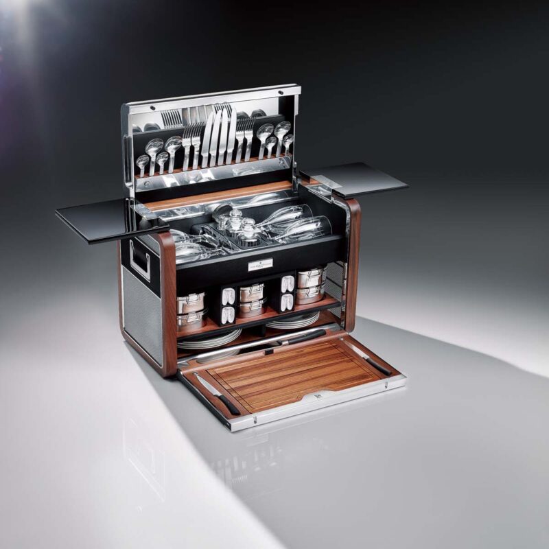 Rolls-Royce為搭上露營野餐風潮,日前推出以頂級馬鞍皮、柚木及鋁金屬來製作的野餐套件組。Rolls-Royce野餐套件組內含4人份餐具、餐盤、水晶酒杯及醒酒器,不論是餐具還是格局規劃,皆能看到如同精品般的