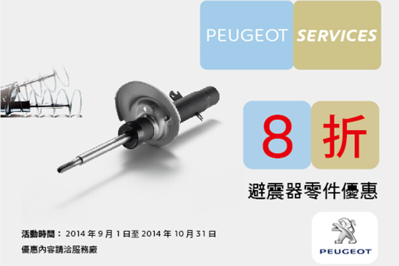 秋高氣爽的宜人氣候是最適合全家出遊之季節,2014年PEUGEOT SERVICES原廠零件優惠活動隆重推出入秋獻禮,活動期間自即日起至10月31日止回廠即可享避震器零件8折優惠…