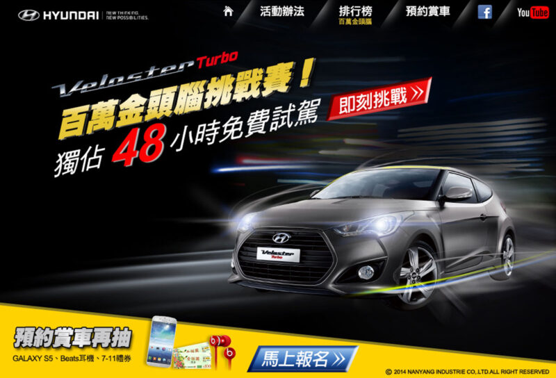 冠亞軍網友共2名可免費體驗Veloster Turbo 酷跑魅力長達48小時,此外透過網路預約賞車還有機會獲得SAMSUNG GALAXY S5手機等多項大獎,機會難得上網行動要快!