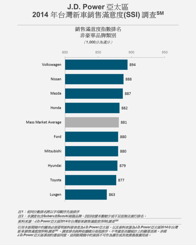 2014年J.D. Power亞太區針對台灣新車市場進行的消費者購車滿意度調查今天(7/31)出爐,在新車買主的購買經驗回饋及穩健的售後追蹤,有助於強化顧客滿意度的調查報告中,即將缷下總代理任務的福斯太古標達名列滿意度第一