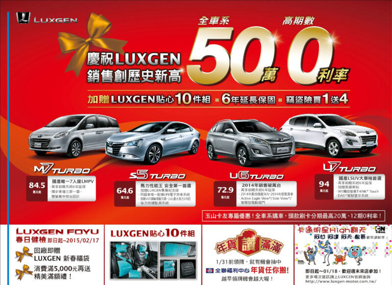 LUXGEN U6 TURBO以年輕活力的特質受到市場高度肯定,帶動2014年全年度全車系銷量,全年超越16,500輛的銷售台數,也創下歷史新高。為了感謝消費者的支持、歡喜迎接新年到來…