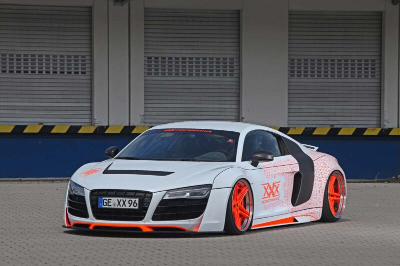 車寬達2米 Schmidt Revolution Audi R8這輛Audi R8 GT並不是新車,可是這輛R8 GT不但直接趴在地上,輪距更是加寬超過2米,為什麼需要改成這樣?主要是為了展示新款鋁圈。Schmidt Revolution為這輛R8 GT裝上前9.5Jx20、後12.5Jx20的鋁