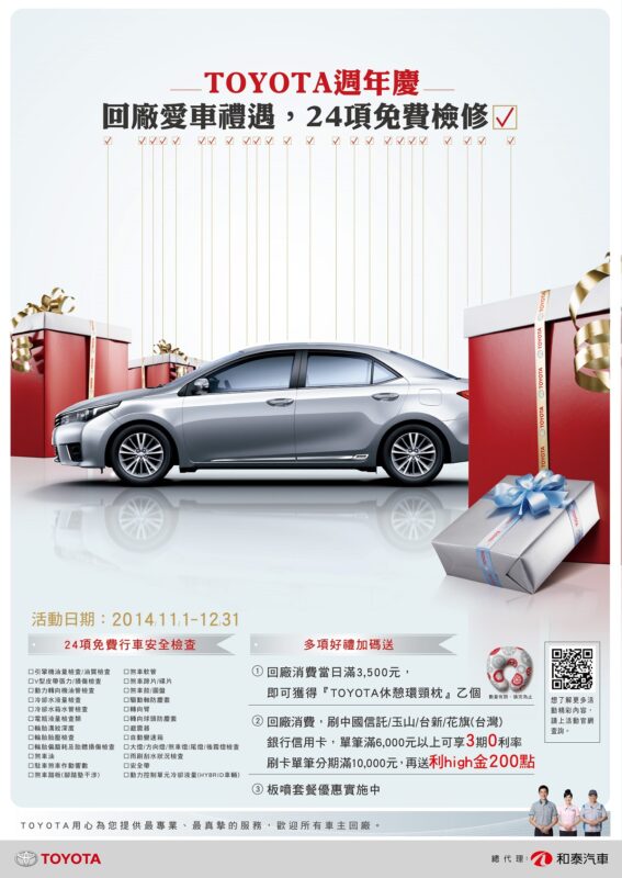 TOYOTA台灣總代理和泰汽車於2014年11月1日起至12月31日期間,舉辦「TOYOTA週年慶 – 回廠愛車禮遇,24項免費檢修」活動,除了24項免費安全檢查之外,更有多項好禮加碼送給車主!