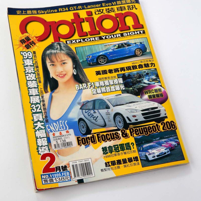 10年回顧-19991999年2月Option正式創刊,內容部分已當時的東京改裝車展居多,對於當時台灣相當少數的改裝車雜誌來說,Option頓時成了所有男人及男孩最愛的書籍。還記得當年筆者還在部隊當兵,每個月都一定要去便利商店購