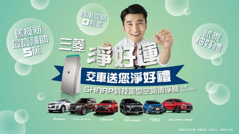 本月中華三菱續推國產車及進口車雙重優惠,入主享好禮超值方案即將進入倒數階段,凡8/10前購買(需完成交車且領牌) NEW COLT PLUS、GRAND LANCER、NEW OUTLANDER、ZINGER、ECLIPSE CROSS、PAJERO任一車種即可獲得SHARP科技美型空氣清淨機。活動期間至中華三菱官網預約試