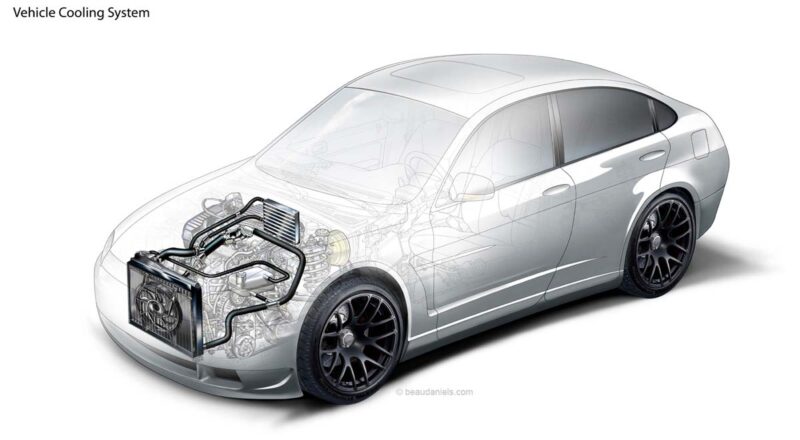 引擎的水冷卻系統也是一個散熱循環的過程,不過需要組合的零件就比冷暖氣系統複雜多了,包括水箱(散熱器)、風扇、水泵、節溫器(水龜)、副水箱、水管、汽缸水套。首先,由引擎