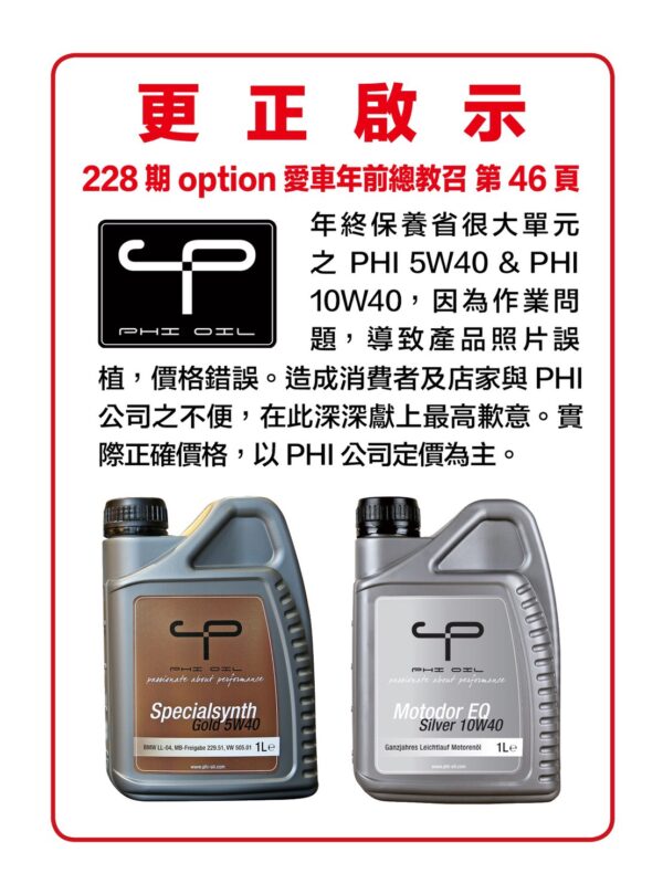 年終保養省很大單元之PHI 5W40 & PHI 10W40,因為作業問題,導致產品照片誤植,價格錯誤。造成消費者及店家與PHI公司之不便,在此深深獻上最高歉意。實際正確價格,以PHI公司定價為主。 -