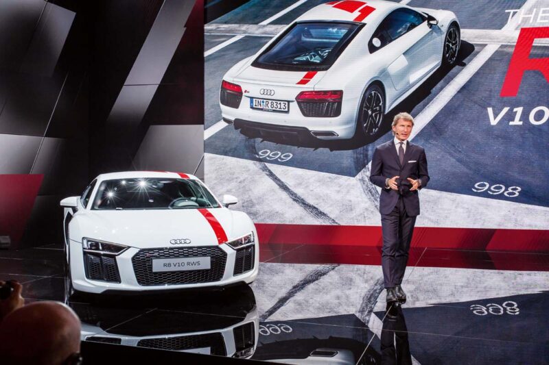 Audi R8 V10 RWS飢餓行銷限量999部Audi Sport部門在法蘭克福車展中,推出取消quattro四驅系統的R8 V10 RWS,而且有著硬頂與敞篷Spyder版本,但卻只限量999部打算來個飢餓行銷。車重較一般R8輕上足足50公斤的R8 V10 RWS,透過5.2升V10引擎釋