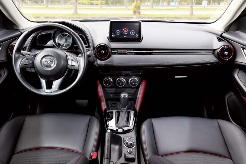 精品高格調Mazda CX-3頂級-跨界休旅車的最終決戰- 配備空間篇在內裝質感方面,CX-3與HR-V、C-HR有相似調性,車內皆以皮質包覆以提昇整體座艙質感氛圍,不過論及皮革使用範圍或是座艙設計,CX-3皆營造出強烈的高級感受,另外透過碳纖維飾板、紅色縫線、亮面烤