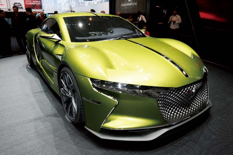 法國精品DS E-TENSE Concept2016年日內瓦車展發表的E-TENSE Concept概念車,徹底運用DS品牌廠徽的X元素,也可說是菱格造型,完全的發揮在車身造型與座艙細節中,加上大膽的車身比例,雙門格局與長車頭