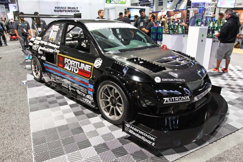 全區域進攻能力Fortune Auto Lancer EVO展場內出現了一輛外觀相當誇張的EVO,鏟土機式樣一看就知道是單圈計時賽式樣,主要的目的就是為了要展示Fortune Auto自家避震器的性能而推出,外觀貼滿了密密麻麻美國當地的贊助貼