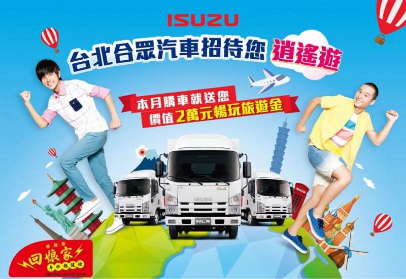 ISUZU繼10月推出購車就送旅遊金的優惠後,活動好評不斷。台北合眾汽車為了感謝頭家們的熱情支持,特別延長優惠至今年年底,凡於活動期間購買ISUZU全車系任一車款,台北合眾汽車就贊助您2萬元的旅遊金