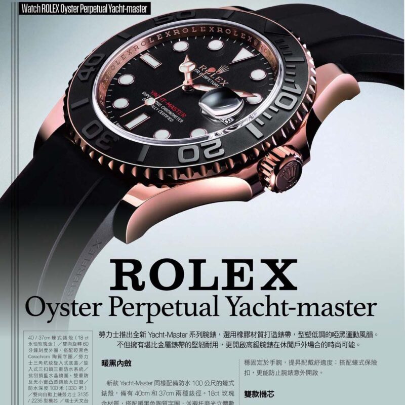 ROLEX Oyster Perpetual Yacht-master 低調酷黑勞力士推出全新Yacht-Master系列腕錶,選用橡膠材質打造錶帶,型塑低調的啞黑運動風韻。不但擁有堪比金屬錶帶的堅韌耐用,更開啟高級腕錶在休閒戶