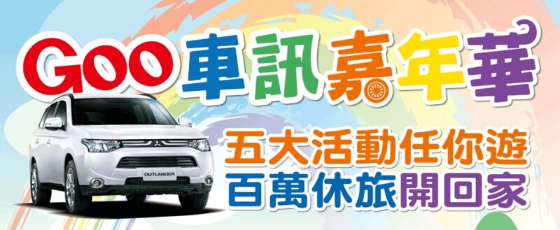 Goo車訊領先業界推出年終最大檔之汽車抽獎活動。於2015/10/1至2016/1/3參加「Goo車訊嘉年華」五大活動,消費金額最低只要0元,即可獲得抽獎券一張。幸運得主更可在過年前得到MITSUBISHI OUTLANDER 2WD時尚版一台,蒐集抽獎券越多,中獎機率越高。首站即將在10/9國慶連假開跑,到圓山花博園區參加承德車聚公益嘉年華,逛2手車展免消費拿名片即有機會抽到百萬休旅。機不可失,詳細活動辦法請參考以下各站說明。