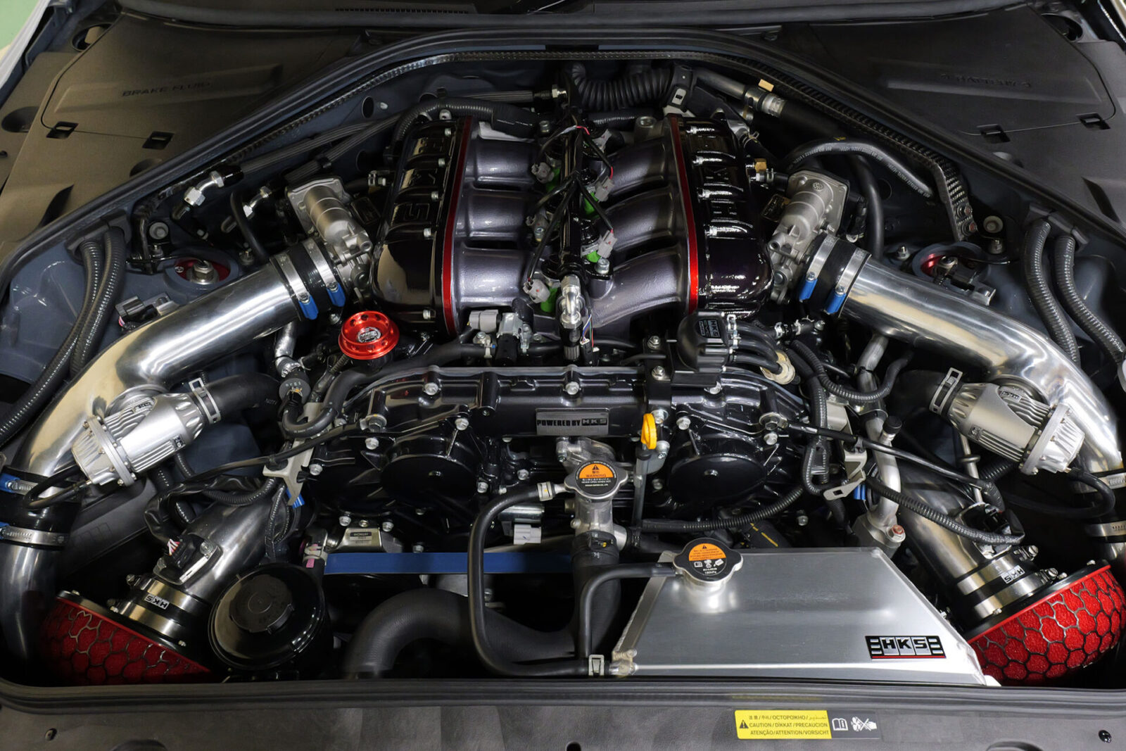 ECU調校則交給F-CON V Pro Ver.3.4協同工作,以極高的精度控制燃油、點火和增壓,並由AF Knock Amp 3爆震感知器提供即時保護。升級的燃油泵系統、兩顆295公升/小時的汽油幫浦、雙HKS調壓器和大容量噴油嘴,共同打造出專為持續1300hp馬力運轉而設計的燃油網路。GT1000規格的中冷器硬體和全套管路,以及精心優化的原廠散熱器和機油冷卻器佈局,確保了熱穩定性;而專用的DCT變速箱和差速器冷卻器,則保護著強化後的GR6變速箱和Nismo最終傳動裝置。