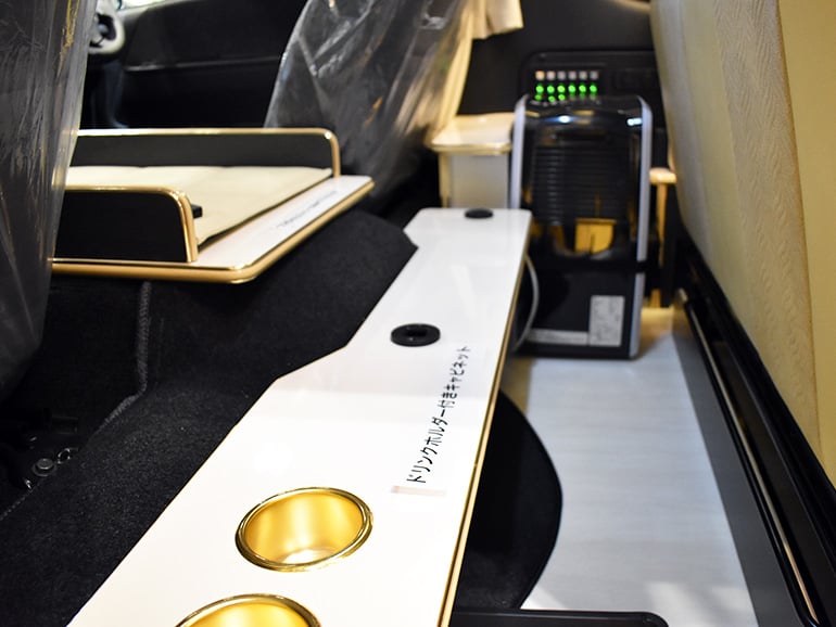 Super Plus配備暖氣、車頂車側斷熱加工、正弦波逆變器(1500W)、導航、ETC、倒車顯影、遮光窗簾、桌子、冰箱(49L)等。
