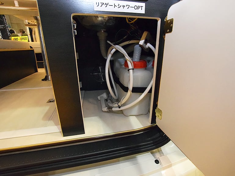 水龍頭、水槽、收納櫃裡擺放著排供水桶(各12L)。雖然沒有配備瓦斯爐、但有標配卡式爐。泡茶、泡咖啡已經很夠了。