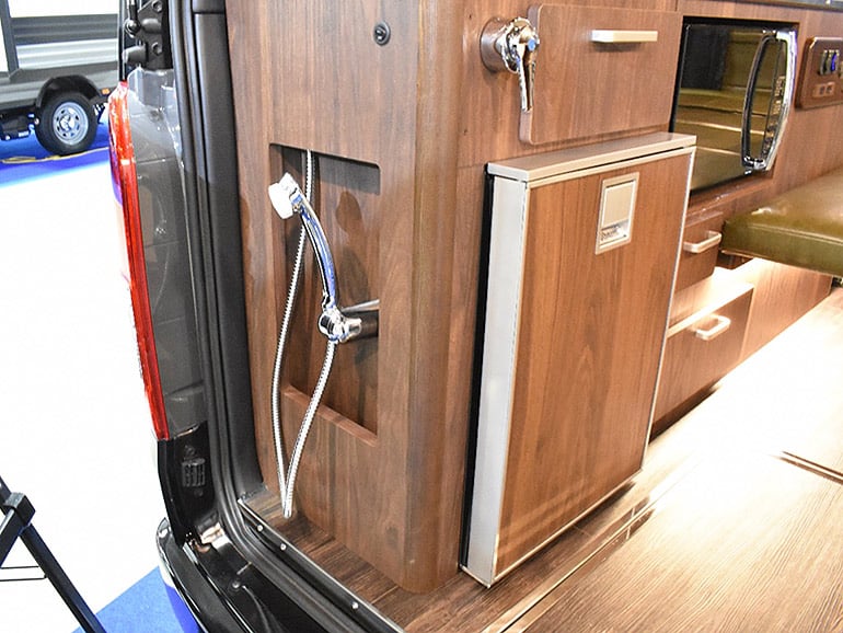 後方流理台下也有配備伸縮外部淋浴設備。流理台下方還有微波爐及冰箱。