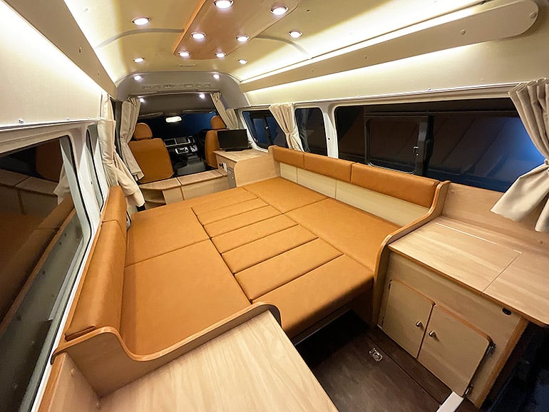 這款露營車將Hiace Super Long寬敞的車內空間,精心配置為適合兩人旅行的露營車。無論是餐椅區還是床鋪尺寸,都非常符合兩人使用的需求。
