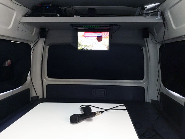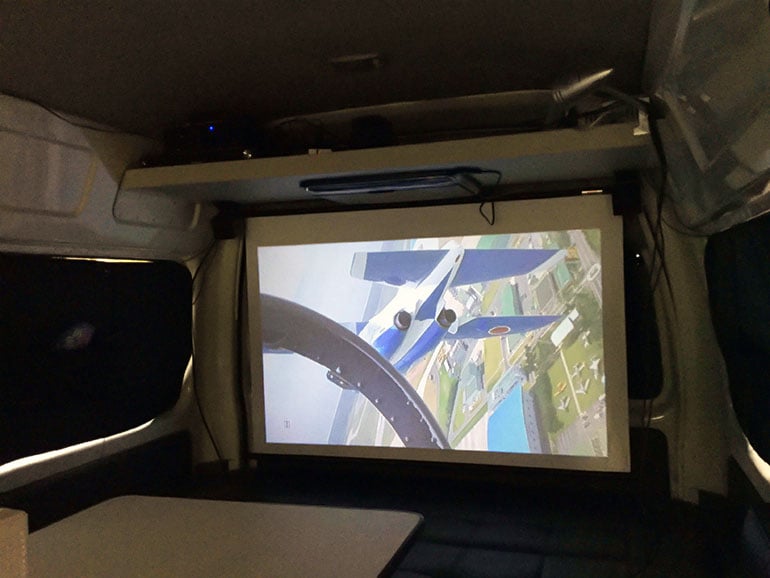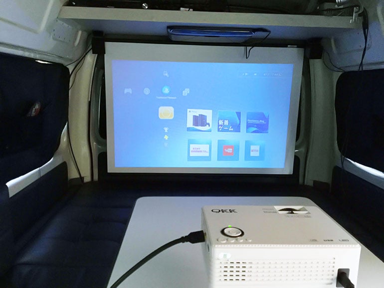 筆者在Hiace車內後方安裝了音響架,配備了5.1聲道音響系統、家中已經很少使用的PlayStation 3、車載地面數位電視接收器和17.3吋翻轉式顯示器。為了享受大螢幕的影片,筆者還設置了LED液晶投影器和投影幕。這些設備都是DIY安裝的。