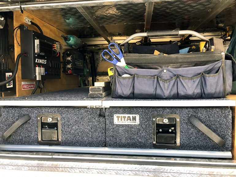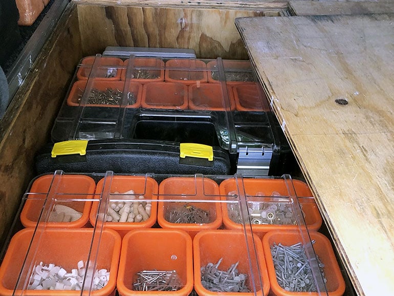 這個木框讓車廂內的整理更加有序,筆者將其高度設置得與旁邊的抽屜齊平,使上方可以放置大型工具。