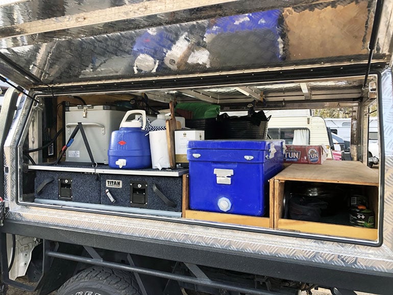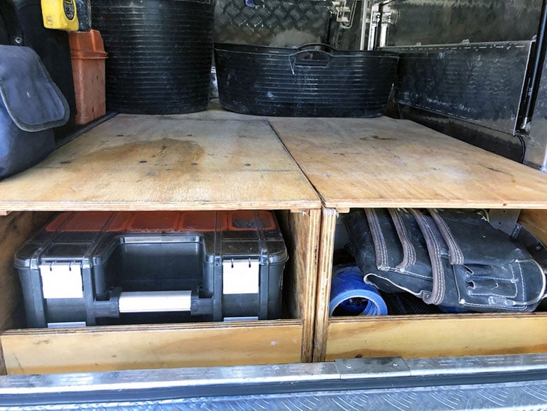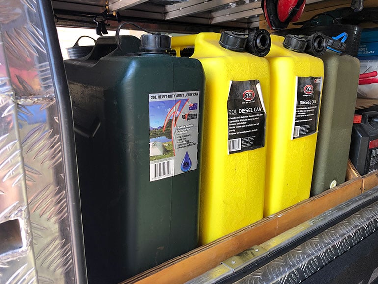露營模式時會放入預備用的20L汽油桶及水箱。它們的尺寸剛好與木框符合,車輛行駛中也不用擔心會傾倒。